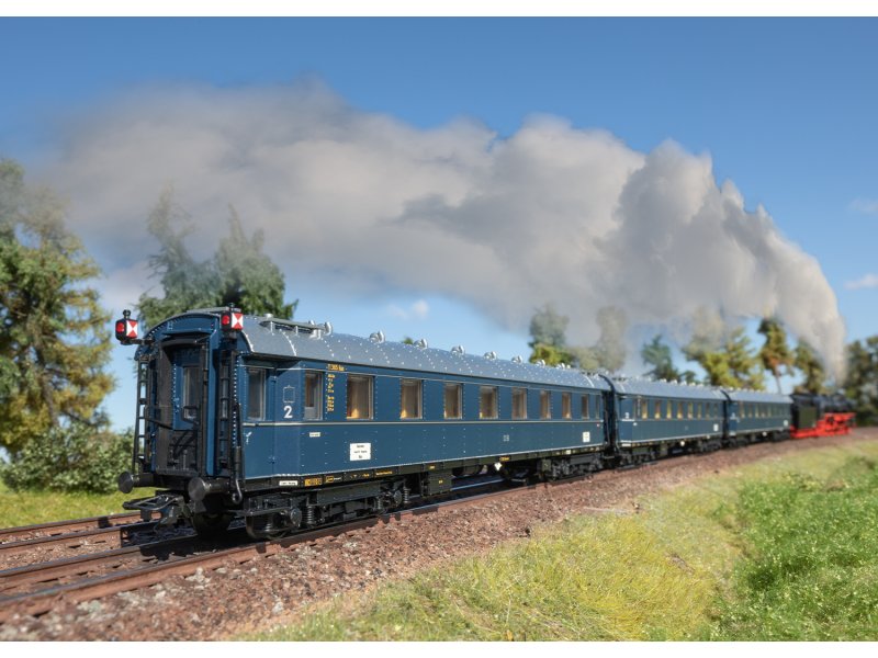 Modell: Detaillierte Ausführung in vollem Längenmaßstab. Alle Wagen mit serienmäßig eingebauter LED-Innenbeleuchtung mit warmweißen Leuchtdioden (LED) und Pufferkondensator. Ein Wagen serienmäßig an einem Ende mit Zugschlussbeleuchtung ausgestattet. Der an diesem Wagen befindliche Schleifer für die Stromaufnahme versorgt über die serienmäßig eingebauten stromführenden Kurzkupplungköpfe den ganzen Wagenverband mit Strom. Dazu ist eine fest definierte Fahrzeugreihenfolge vorgegeben. An beiden Enden des Wagenverbandes sind die normalen neuen Kurzkupplungsköpfe für niedrigere Pufferhöhen eingesetzt. Reisezugwagen mit mehrfarbiger Inneneinrichtung. Drehgestelle der Bauart Görlitz II schwer. Stirnseitig separat angesetzte Aufstiegsleitern und angesetzte Griffstangen. Befahrbarer Mindestradius 360 mm. Gesamtlänge über Puffer ca. 75,5 cm.