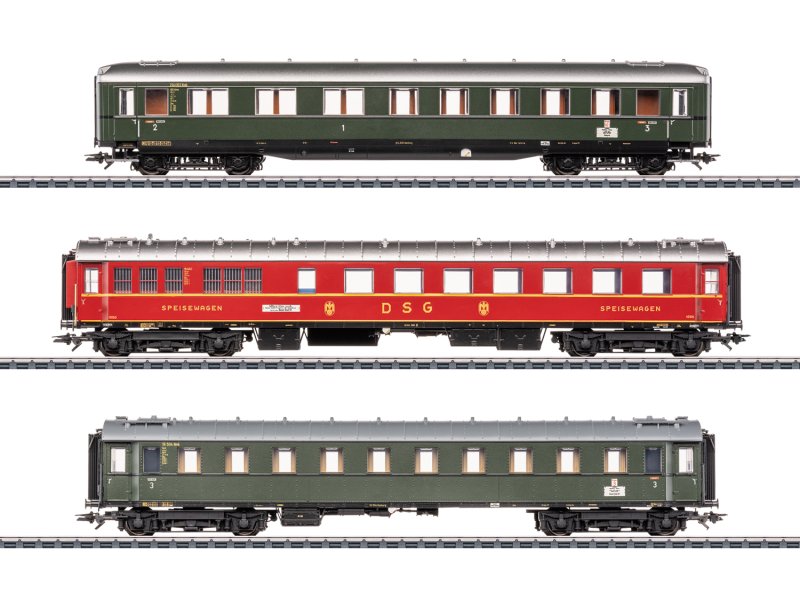 Vorbild: Schnellzugwagen-Set besteht aus den folgenden 3 Wagen unterschiedlicher Bauarten zum Schnellzug D 74. 1 vierachsiger Schürzenwagen ABC4üwe, 1./2./3. Klasse. 1 vierachsiger Speisewagen WR4ü(e) der DSG (Einheitsbauart 1928-30). 1 vierachsiger Sitzwagen C4ü, 3. Klasse (Einheitsbauart 1928-30). Zuglauf: D 74 Hamburg Altona - Basel SBB, für den Streckenabschnitt Frankfurt-Basel SBB. Deutsche Bundesbahn (DB) und Deutsche Speisewagen- und Schlafwagen-Gesellschaft (DSG). Betriebszustand um 1955.