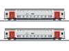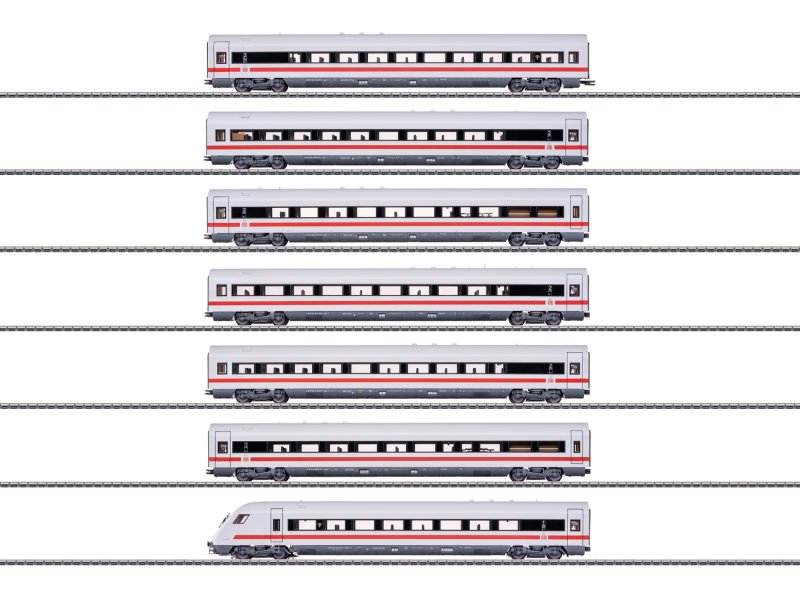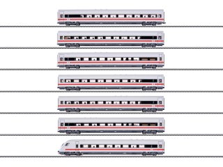Modell: Alle Wagen mit serienmäßig eingebauter indirekter LED-Innenbeleuchtung, dimmbar und digital schaltbar über Decoder im Steuerwagen. Mit Pufferkondensatoren zur Überbrückung kurzer stromloser Stellen. Steuerwagen mit mfx-Digital-Decoder. Dreilicht-Spitzensignal und zwei rote Schlusslichter konventionell in Betrieb, digital schaltbar. Fernlicht, Führerstandbeleuchtung und Fahrpult-Beleuchtung im Steuerwagen jeweils separat digital schaltbar. Stromführende 4-polige Kupplungen zwischen den Schnellzugwagen. Am Schnellzugwagen mit der Ordnungsnummer 1 ist eine 2-polige Kupplung im Normschacht eingesteckt, als elektrische Verbindung zur Lokomotive. Beleuchtung mit wartungsfreien warmweißen und roten Leuchtdioden (LED). Wagen 1 zur Lok gerichtet mit Gummiwulst-Übergang. Detaillierte Darstellung der mehrfarbigen Inneneinrichtungen. Befahrbarer Mindestradius 360 mm, ohne Beachtung des Lichtraum-Profils. Für größere Radien kann im Bereich der Kupplungen an den Wagen-Enden jeweils die serienmäßig montierte gegen eine separat beiliegende Schürze getauscht werden. Für die volle Funktionsfähigkeit des ganzen Zuges ist eine definierte Fahrzeugreihenfolge vorgegeben. Länge über Puffer ca. 214 cm.