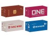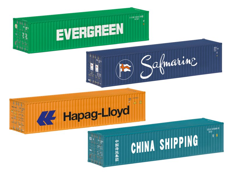Modell: Set bestehend aus vier 40-ft.-Standard-Boxcontainern in unterschiedlicher Gestaltung zur Ergänzung und passend zu allen vorhandenen Märklin/Trix Containertragwagen der Bauarten Sgns und Lg(n)s sowie Doppel-Containertragwagen der Bauart Sggrrs.
