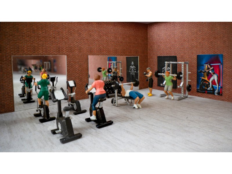 Figuren-Themenwelt äFitness-Studio, Inhalt: 1 Mann beim Bankdrücken, 1 Mann mit Kurzhanteln, 1 Mann auf Fahrrad, 1 Frau auf Crosstrainer, 1 Frau am …