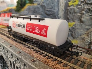 Das extra gestaltete "160 Jahre Grimm" Logo mit der Silhouette der Zweiburgenstadt Weinheim, sowie den Firmenlogos des Weinheimer Traditionsfachgeschäftes ziert die eine Seite des Kesselwagens in den Farben rot und schwarz.