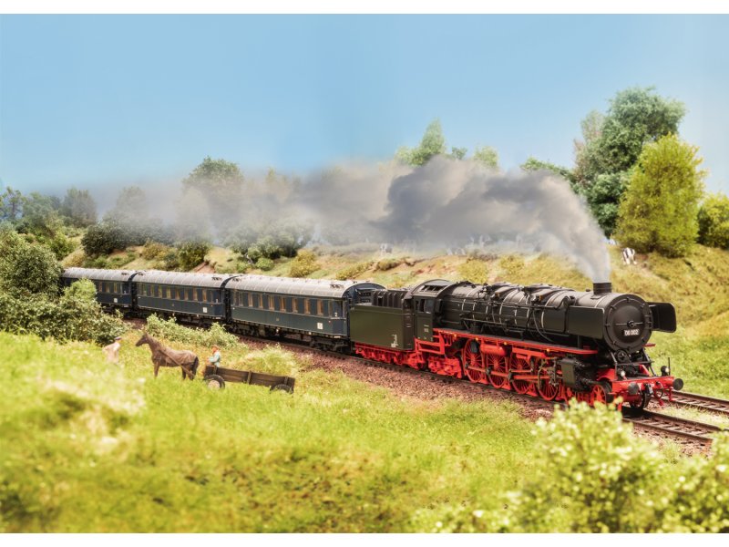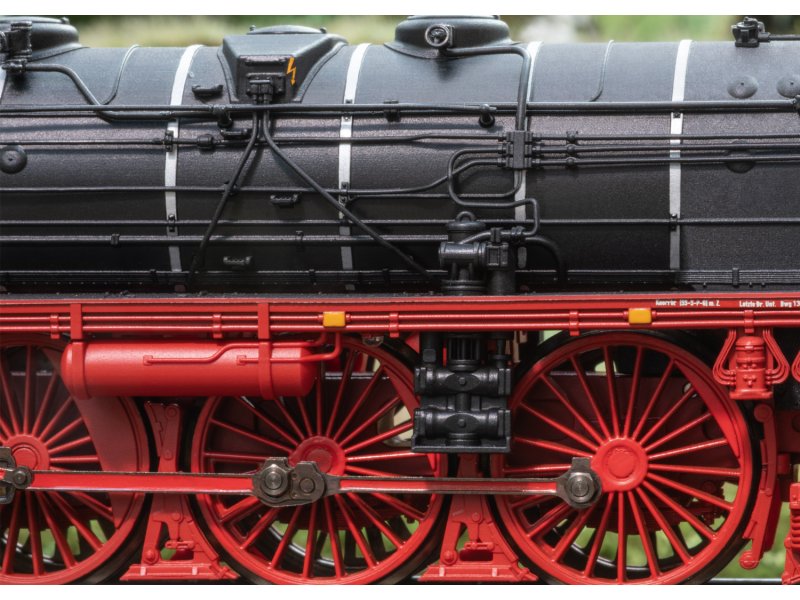 Modell: Mit Digital-Decoder und umfangreichen Geräuschfunktionen. Geregelter Hochleistungsantrieb mit Schwungmasse im Kessel. Eine Achsen angetrieben, drei Achsen über Kuppelstange angetrieben. Haftreifen. Lokomotive und Tender weitgehend aus Metall. Serienmäßig eingebauter Rauchgenerator mit geschwindigkeitsabhängigem, dynamischem Rauchausstoß. Fahrtrichtungsabhängig wechselndes Zweilicht-Spitzensignal konventionell in Betrieb, digital schaltbar. Führerstandbeleuchtung, Feuerbüchsenflackern und Fahrwerkbeleuchtung separat digital schaltbar. Beleuchtung mit wartungsfreien warmweißen und roten Leuchtdioden (LED). Mit Pufferspeicher. Kurzkupplung mit Kinematik zwischen Lok und Tender. Am Tender kinematikgeführte Kurzkupplung mit NEM-Schacht. Pufferhöhe an Lok und Tender nach NEM. Befahrbarer Mindestradius 437,5 mm. Mit leichten Einschränkungen in Radius 1 fahrfähig. Kolbenstangenschutzrohre und Bremsschläuche liegen bei. Länge über Puffer ca. 31 cm.
