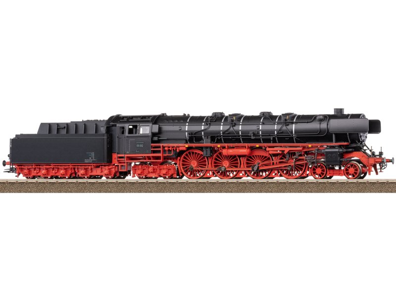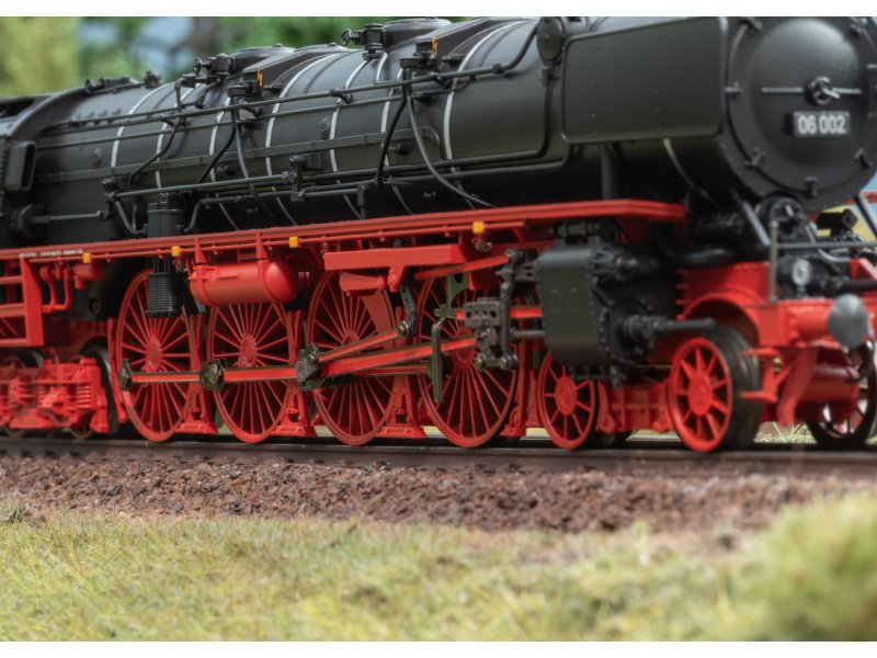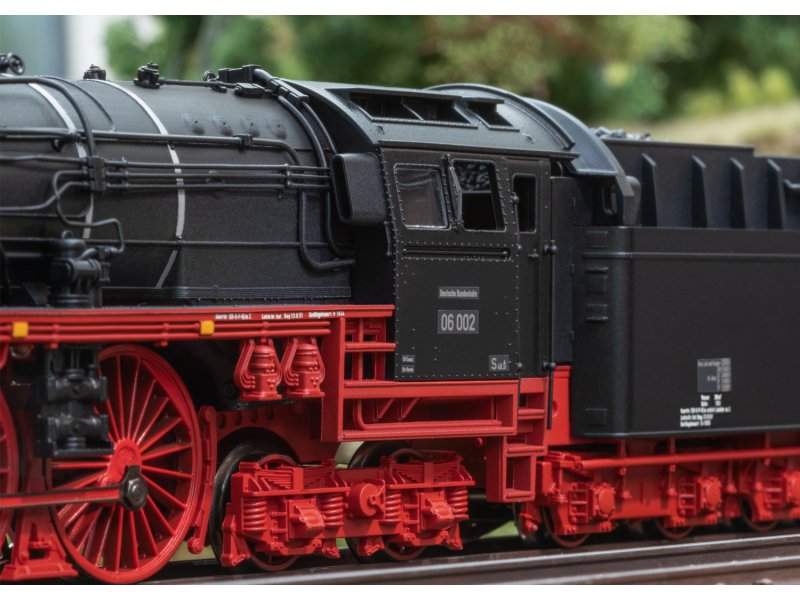 Vorbild: Schnellzug-Dampflokomotive 06 002 der Deutschen Bundesbahn (DB). In fiktiver Ausführung ohne Stromlinienverkleidung, mit Kohlen-Schlepptender 2´3 T38, Zweilicht-Spitzensignal, Witte-Windleitbleche und einseitiger Indusi. Heimatbetriebswerk Hamm. Betriebszustand 1952.