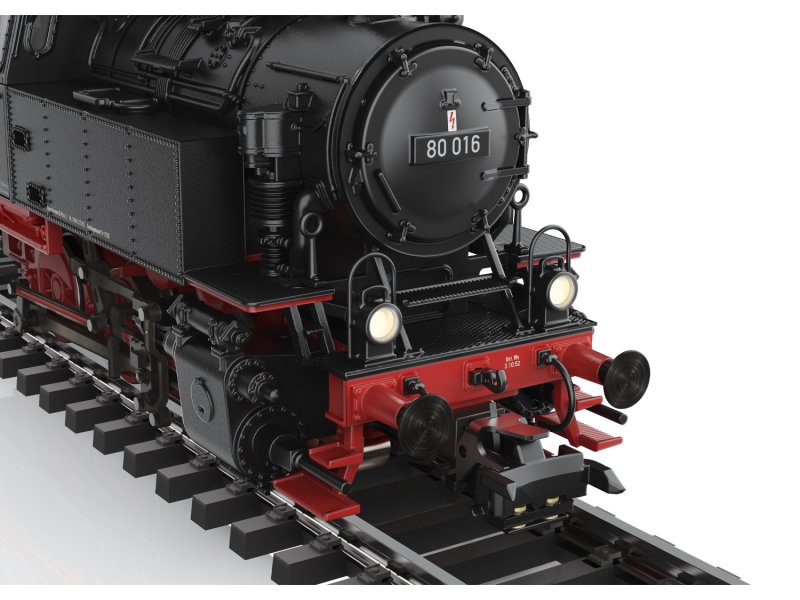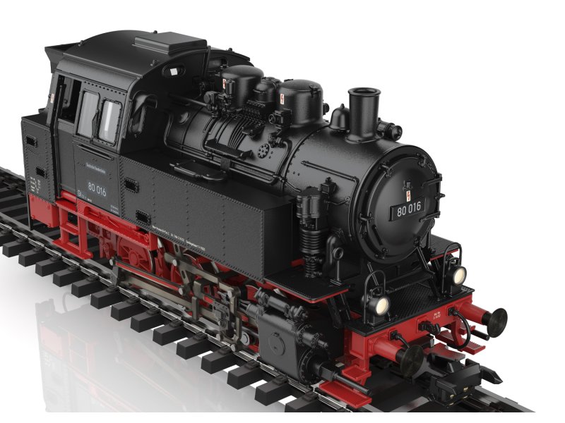 Vorbild: Tenderlokomotive Baureihe 80 der Deutschen Bundesbahn. Ausführung mit drei Kesselaufbauten, Läutewerk und Turbodynamo links, Rauchkammertüre ohne Zentralverschluss mit Nummernschild mittig. Tiefschwarze Grundfarbgebung. Betriebsnummer 80 016. Betriebszustand um 1953.