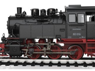 Vorbild: Tenderlokomotive Baureihe 80 der Deutschen Bundesbahn. Ausführung mit drei Kesselaufbauten, Läutewerk und Turbodynamo links, Rauchkammertüre ohne Zentralverschluss mit Nummernschild mittig. Tiefschwarze Grundfarbgebung. Betriebsnummer 80 016. Betriebszustand um 1953.