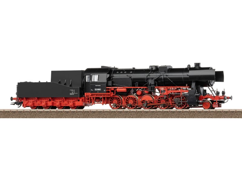 Vorbild: Schwere Güterzug-Dampflokomotive Baureihe 52, mit Steifrahmen-Tender K4 T30 der Deutschen Bundesbahn (DB). Schwarz/rote Grundfarbgebung. Witte-Windleitbleche. Vorlauf-Radsatz mit Vollrädern. Lok-Betriebsnummer 52 6884. Betriebszustand um 1951.