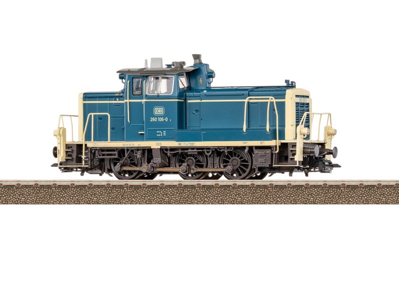 Vorbild: Diesel-Rangierlokomotive Baureihe 260 der Deutschen Bundesbahn (DB). Grundfarbgebung ozeanblau/elfenbein. Dieselhydraulischer Antrieb mit Blindwelle. Vorbauten und Führerhaus der Serienausführung. Kühlergitter in verstärkter Form mit breitem Rahmen. Führerhausdach in der Bauform der Loks bis ca. V 60 390. Führerhausdach mit Lüftungsklappen. Mit Zugbahnfunk und beidseitig Indusi. Erste Form des Schalldämpfers. Mit Dofa-Ofen ohne Kohlebehälter. Betriebsnummer 260 106-0. Betriebszustand um 1980.