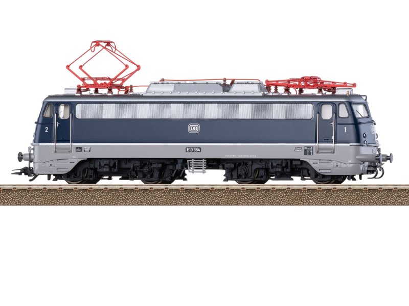 Vorbild: Elektrolokomotive Baureihe E10.3 der Deutschen Bundesbahn (DB). Lokkasten mit aerodynamischer Front, der sogenannten Bügelfalte, mit durchgehendem Lüfterband, umlaufender Regenrinne und stirnseitigen Griffstangen. Mit Pufferverkleidung und Schürze. Stahlblauer Lok-Aufbau mit steingrauem Rahmen. Lok-Betriebsnummer E10 384. Betriebszustand um 1967.
