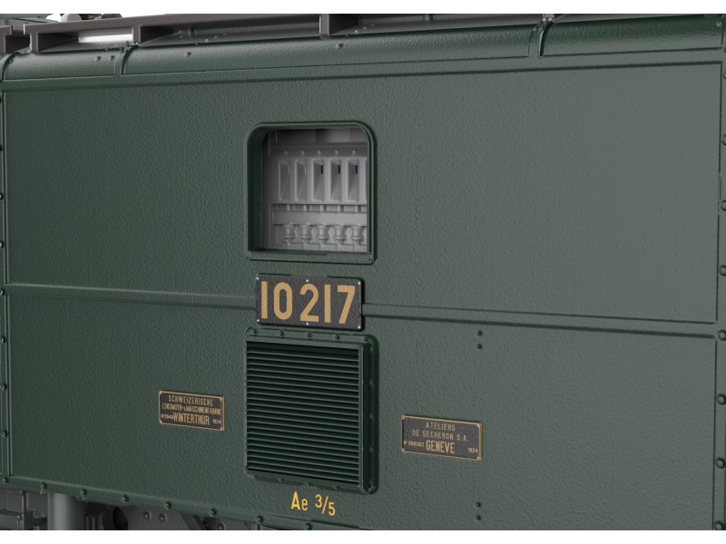 Vorbild: Elektrolokomotive Ae 3/5 der Schweizerischen Bundesbahnen (SBB/CFF/FFS). Mit stirnseitigen Übergangsblechen und Falschfahrsignal über dem oberen Spitzensignal. Tannengrüne Grundfarbgebung mit grauem Fahrwerk. Lok-Betriebsnummer 10217. Betriebszustand 2022.