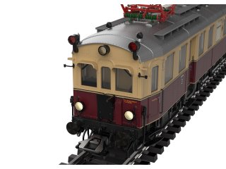 Modell: Triebwagen elT als angetriebene Einheit mit Digital-Decoder und umfangreichen Geräuschfunktionen. Geregelter Hochleistungsantrieb. Vier Achsen angetrieben. Haftreifen. Zweilicht-Spitzensignal und zwei rote Schlusslichter über beide Einheiten an den äußeren Stirnseiten mit der Fahrtrichtung wechselnd, digital schaltbar. Zusätzlich 3. Spitzenlicht oben als Zugbegegnungslicht jeweils in Fahrtrichtung vorne separat digital schaltbar. Beide Einheiten sind über eine mehrpolige Kupplung fest miteinander Gekuppelt. Innenbeleuchtungen im Triebwagen elT und Steuerwagen elS konventionell in Betrieb, digital schaltbar. Beleuchtung mit wartungsfreien warmweißen Leuchtdioden (LED). Spitzensignal an Triebwagenseite 1 und Steuerwagenseite 2 jeweils separat digital abschaltbar. Führerstandbeleuchtung an den äußeren Führerständen separat digital schaltbar.Mit Pufferspeicher. Sehr detaillierte Ausführung von Fahrwerk und Aufbau. Wagenkasten und Wagenboden aus Metall. Mehrteilige und mehrfarbige Inneneinrichtung. Nachgebildete Glocke, Bremsleitungen und zwei Kurzkupplungsköpfe liegen bei. Gesamtlänge über Puffer ca. 46,8 cm.