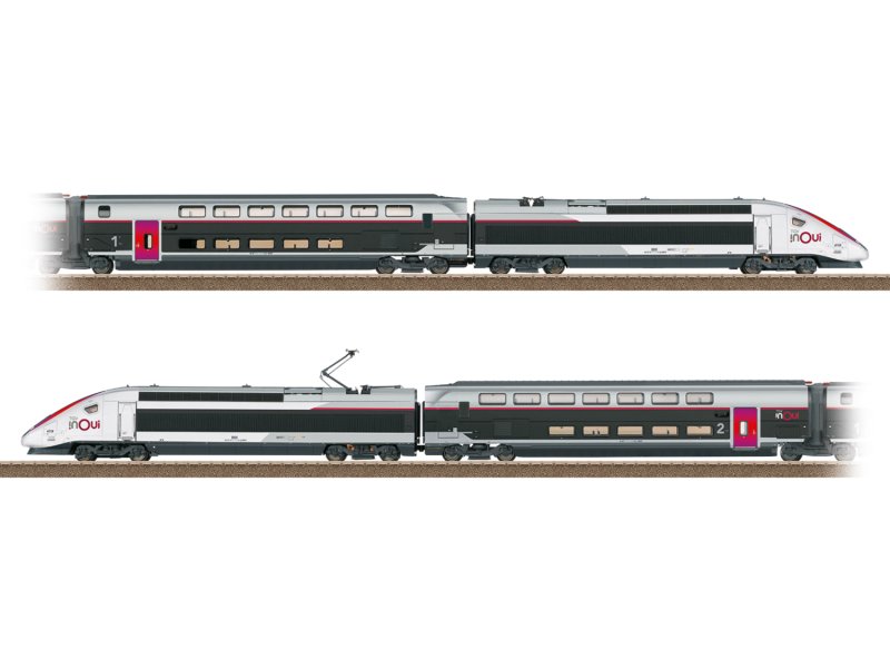 Modell: 4-teilige Grundgarnitur. Beide Triebköpfe (M1 und M2) motorisiert. Mit Digital-Decoder und umfangreichen Geräuschfunktionen. Geregelter Hochleistungsantrieb in beiden Triebköpfen, zentral eingebaut. Jeweils 4 Achsen über Kardan angetrieben. Haftreifen. Serienmäßig eingebaute Innenbeleuchtung. Fahrtrichtungsabhängig wechselndes Dreilicht-Spitzensignal, 2 rote Schlusslichter und Innenbeleuchtung konventionell in Betrieb, digital schaltbar. Drittes Spitzenlicht für französischen Lichtwechsel digital separat abschaltbar (Lichtfunktion). Beleuchtung mit wartungsfreien warmweißen und roten Leuchtdioden (LED). Mit Pufferspeicher. Führerstände in den Triebköpfen mit Inneneinrichtung. Separat angesetzte Griffstangen aus Metall. Triebkopf und Übergangswagen sind paarweise fest miteinander gekuppelt, mit Spezial-Kurzkupplungen und Kulissenführung. Zusätzliche Kulissenführung im Jakobs-Drehgestell. Fahrtrichtungsabhängige Stromversorgung über den jeweils vorderen Triebkopf. Innenbeleuchtung wird versorgt über die durchgehende elektrische Verbindung des ganzen Zuges. Jeder Triebkopf mit 2 Einholm-Stromabnehmer in unterschiedlichen Ausführungen mit jeweils einer Wippe für DB und SNCF. Stromabnehmer sind nur mechanisch, nicht elektrisch funktionsfähig. Maßstäbliche Nachbildung, daher befahrbarer Gleisbogen ab Mindestradius 360 mm bei freiem Lichtraum. Länge der 4-teiligen Grundgarnitur 102 cm.