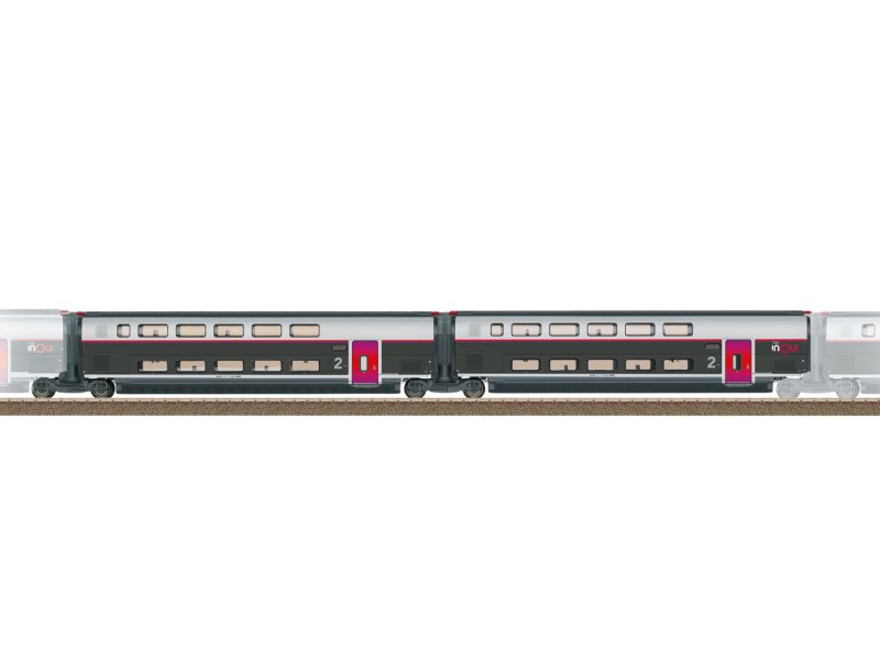 Modell: 2-teiliges Ergänzungswagen-Set zur Erweiterung des Hochgeschwindigkeitszuges TGV INOUI, Artikel 22482, auf eine 10-teilige Einheit. Serienmäßig eingebaute Innenbeleuchtung mit wartungsfreien warmweißen Leuchtdioden (LED). Innenbeleuchtung wird versorgt über die durchgehende elektrische Verbindung des ganzen Zuges. Beide Mittelwagen sind fest miteinander gekuppelt. Kulissenführung in den Jakobs-Drehgestellen. Maßstäbliche Nachbildung, daher befahrbarer Gleisbogen ab Mindestradius 360 mm bei freiem Lichtraum. Länge des Wagenpaares 43 cm.