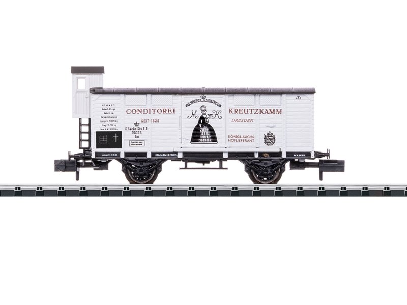 Modell: Zweiachsiger Privatgüterwagen mit fiktiver Beschriftung der Conditorei Kreutzkamm. Mit Kinematik für Kurzkupplung. Länge über Puffer 60 mm.