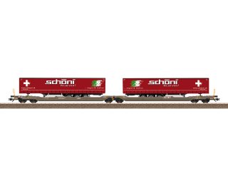 Modell: Beide Tragwagenhälften aus Metall, beweglich gelagert auf dem mittleren Drehgestell. Seitliche Klappriegel ab Werk montiert. Hochklappbar für den Transport von Containern oder Wechselbrücken. Viele separat angesetzte Details wie Tritte, Bremsleitungen und Haltestangen an den Wagenenden. Drehgestelle Bauart Y25. Pufferhöhe nach NEM. Halterungen für Königszapfen in hoher und niedriger Ausführung, Rangiertritte und Luftkessel für die Wagenenden liegen als separat ansteckbare Teile bei. Beladen mit zwei Gardinenplanen-Sattelaufliegern der Spedition Schöni. Länge über Puffer ca. 39,3 cm.Wechselstromradsatz E376938.