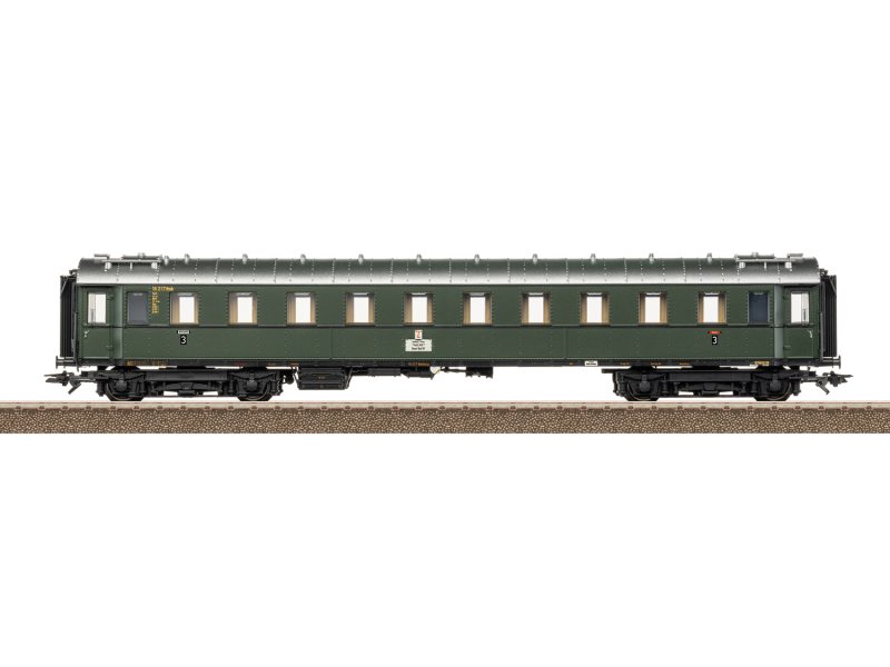 Modell: Detaillierte Ausführung in vollem Längenmaßstab. Befahrbarer Mindestradius 360 mm. Mit serienmäßig eingebauter LED-Innenbeleuchtung, mit warmweißen Leuchtdioden (LED) und Pufferkondensator. Der Wagen ist mit den neuen Kurzkupplungsköpfen für niedrigere Pufferhöhen ausgestattet. Ein kurzer Faltenbalg für das Zug-Ende liegt zum Austausch bei. Aufgedrucktes Wagenlaufschild und Ordnungsnummer. Ein Leporello zeigt die Darstellung des gesamten Zuges und die vorbildgerechte Einordnung der einzelnen Wagen im Zug-Verband. Länge über Puffer 25 cm.
