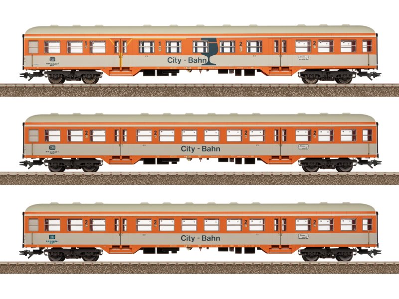 Vorbild: Set bestehend aus drei Personenwagen unterschiedlicher Bauarten der Deutschen Bundesbahn. Zwei Wagen der Bauart Bnrzb 778.1, 2. Klasse und ein Wagen der Bauart ABnrzb 772.2, 1./2. Klasse mit Cafeteria-Abteil. Zuglauf: Köln-Gummersbach. Reinorange/Kieselgraue Grundfarbgebung. Betriebszustand ab 1986.
