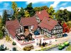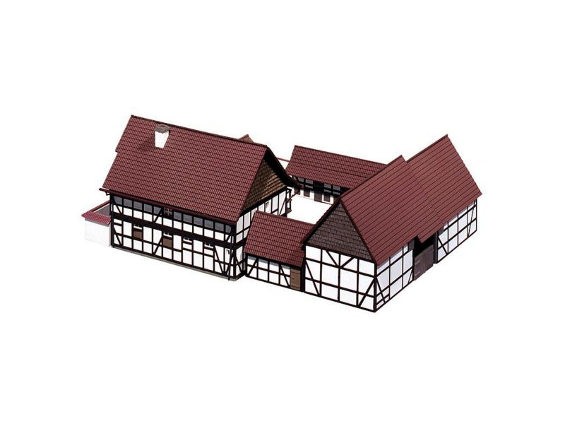 Dreiseit-Hof nach einem Original in Obernfeld, Niedersachsen. Das Fachwerkmodell, dessen Elemente sich auch getrennt voneinander bauen lassen, setzt sich zusammen aus einem Wohngebäude mit Storchennest auf dem Dach, Scheune, Schweinestall und Schafstall, einem Lattenzaun sowie zahlreichen Zubehörteilen, wie die Hundehütte oder der Mistwagen.