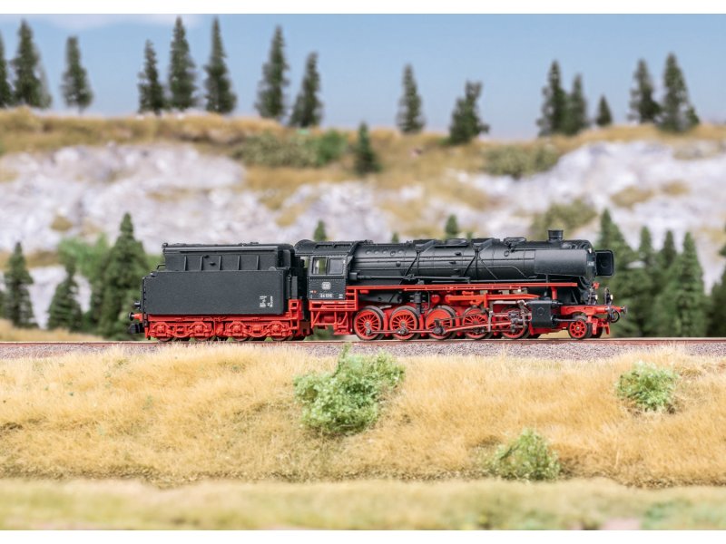 Modell: Lokomotive und Tender überwiegend aus Metalldruckguss. Glockenankermotor mit Schwungmasse im Kessel eingebaut. 5 Achsen über Kuppelstangen angetrieben, Haftreifen. Eingebauter mfx-DCC-Digital-Decoder und Geräuschgenerator. Lok und Tender kurzgekuppelt. 3-Licht-Spitzensignal, Triebwerks- und Führerstandsbeleuchtung aus warmweißen LED. 3-Licht-Spitzensignal analog in Betrieb. Kupplungsaufnahme nach NEM am Tenderende. Rauchkammertür zu öffnen. Kolbenstangenschutzrohre liegen bei.Länge über Puffer 141 mm.