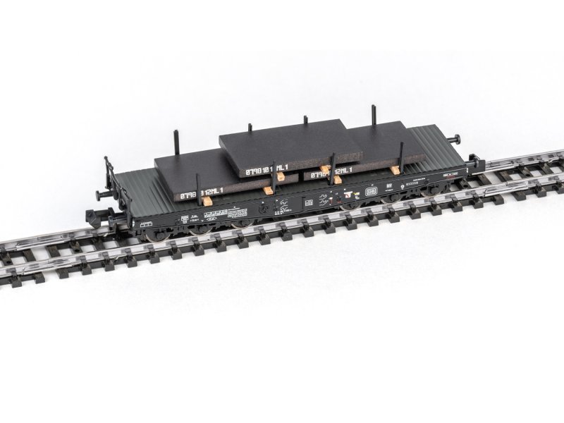 Modell: Beladen mit 3 Stahlbrammen-Nachbildungen in realistischer Ausführung. Einsteckbare Rungen. Fahrgestell aus Metalldruckguss, Kupplungsaufnahme nach NEM und Kinematik für Kurzkupplung. Länge über Puffer 84 mm.