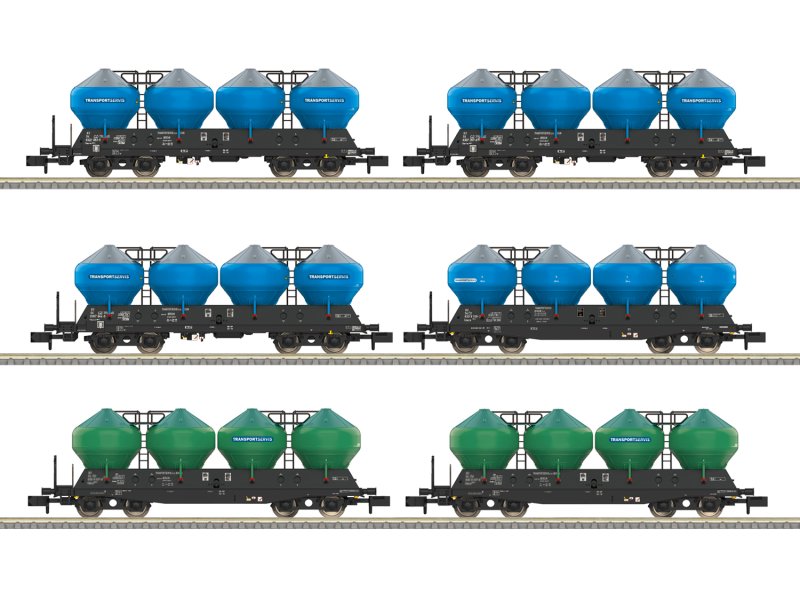 Vorbild: 6 vierachsige Silowagen der Bauart Uacs der Bahngesellschaft TRANSPORTSERVIS a.s. in Tschechien. 3 Silowagen in der Ausführung mit geradem Langträger und 3 Silowagen in der Ausführung mit Schürze. 4 Wagen mit blauen und 2 Wagen mit grünen Behältern. Betriebszustand um 2011.