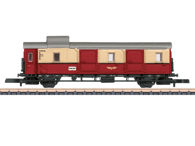 Vorbild: 2-achsiger Gepäckwagen Donnerbüchse, Einheitswagen Pwi. Privatwagen als Museumsbahn-Wagen. Mit Wagenlaufschild Sonderfahrt. Historisch angenäherter Zustand der Epoche III.