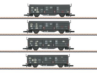 Vorbild: 4 zweiachsige Schiebedach-/Schiebewandwagen der Bauart Tbis 871 (Klmmgks 68) der Deutschen Bundesbahn (DB). Mit stirnseitigen Bühnen. Betriebszustand der 1980er Jahre.
