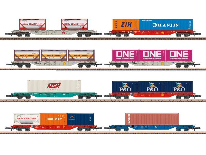 Modell: 8 verschiedene Containertragwagen Sgns 691 hergestellt aus metallgefülltem Kunststoff beladen mit unterschiedlichen Containern. Wagen fein detailliert mit Scheibenräder. Container mit individueller Nummer und fein beschriftet. Länge über Puffer je Einzelwagen ca. 90 mm.