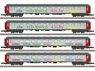 Vorbild: Vier schwedische Abteilwagen Typ Bmpz (2. Klasse), registriert in Österreich. Darstellung des Berlin-Malmö-Express. Beschriftet auf der einen Seite mit Snälltåget und auf der anderen Seite mit den angefahrenen Bahnhöfen (Are, Stockholm, Malmö, Berlin). Aktueller Betriebszustand.